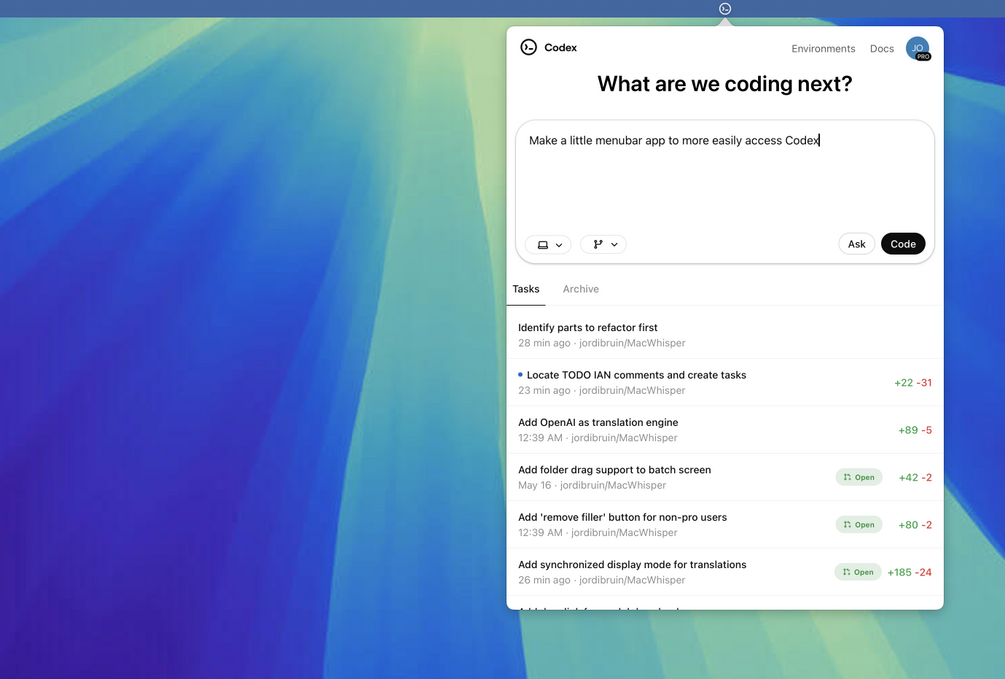 CodexBar is a very simple menubar app that gives direct access to the Codex website.