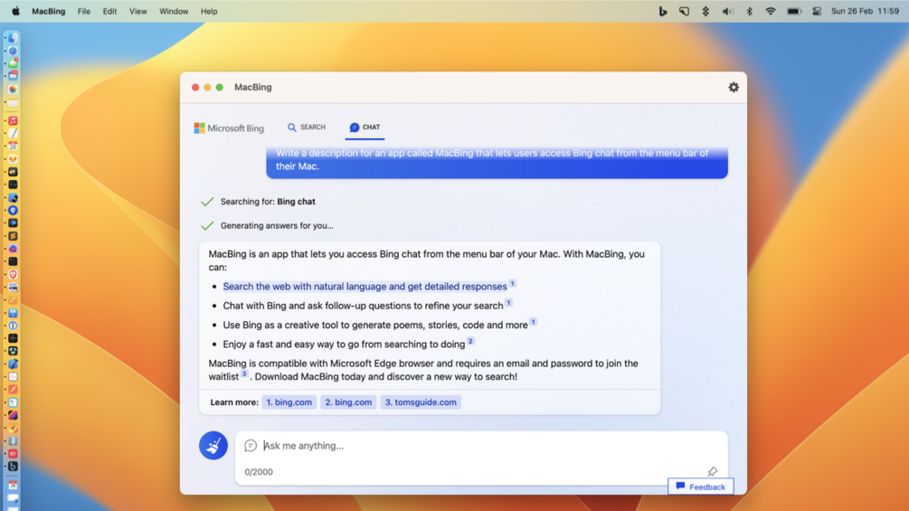 MacBing is perfect for anyone who wants an easy and efficient way to use Bing Chat on their Mac. Try it out today and see how it can enhance your experience with Bing Chat!