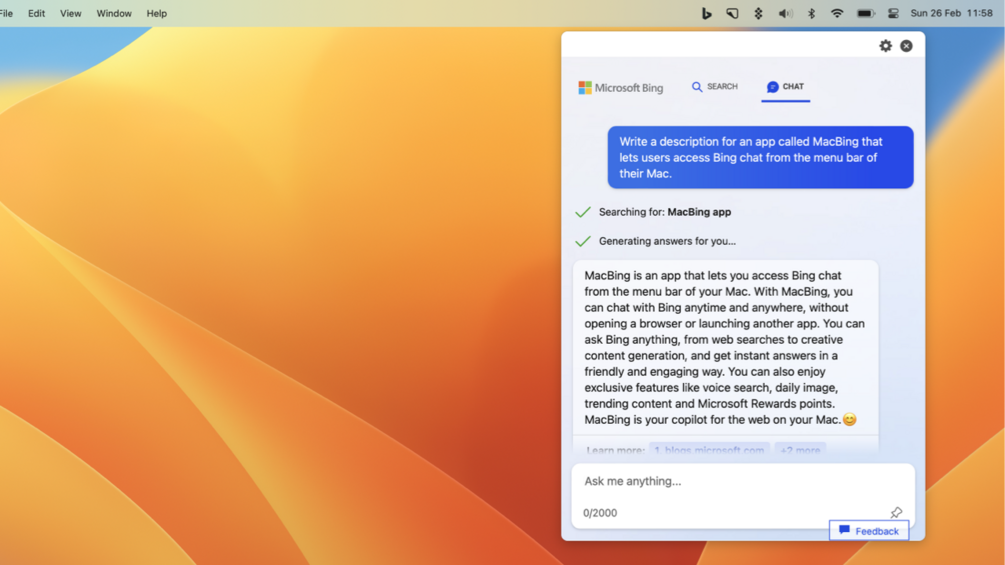 MacBing is perfect for anyone who wants an easy and efficient way to use Bing Chat on their Mac. Try it out today and see how it can enhance your experience with Bing Chat!