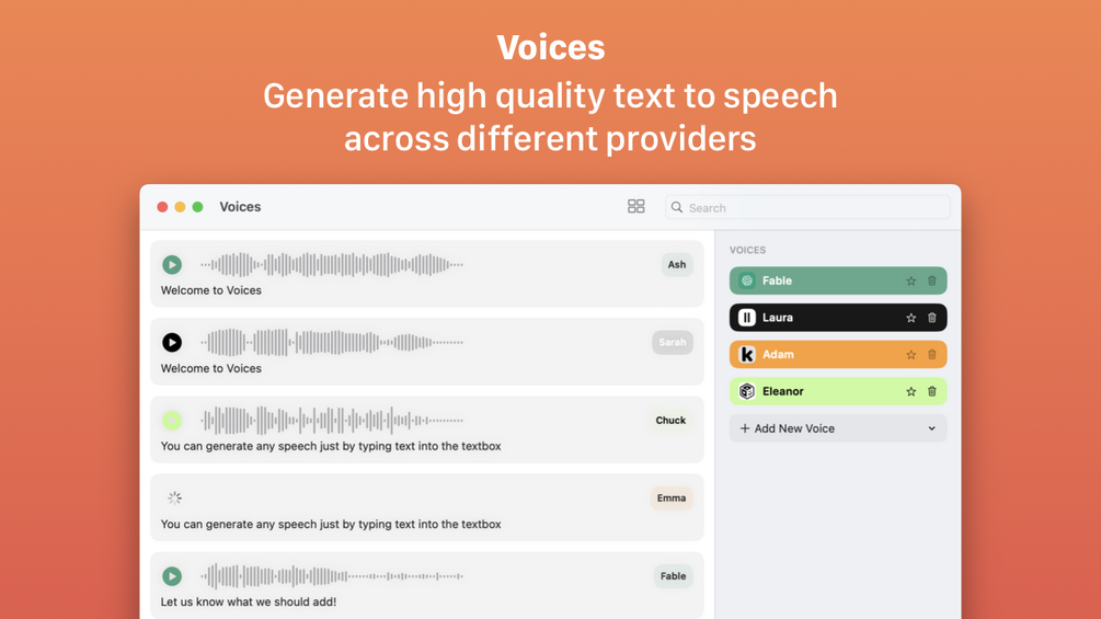 Voices lets you generate text to speech from different providers in a simple interface on your Mac. Just bring your own API keys and start generating!
